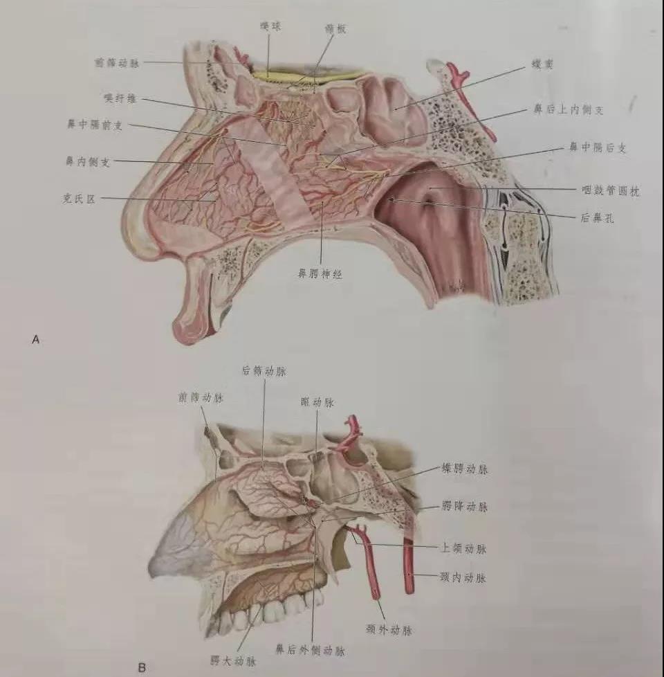 图1:鼻腔的血液供应。鼻内侧壁(A)和外侧壁(B)的血液供应为颈内外动脉系统分支。