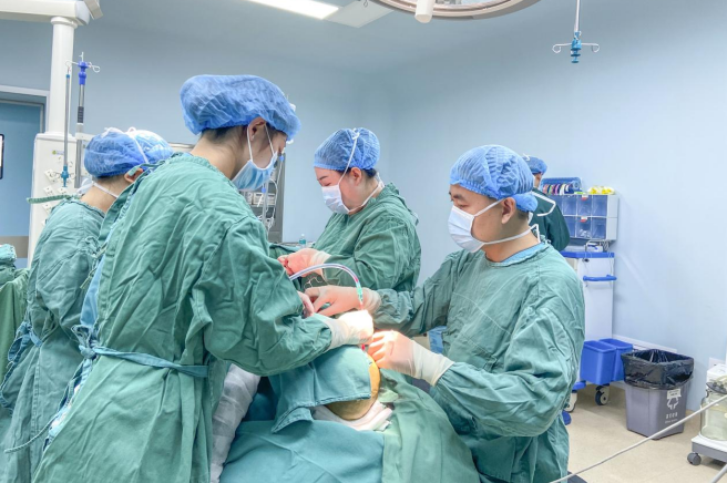 术中,王江允教授和张朝梅主任在完成耳廓再造Ⅱ期手术后,将骨导助听器植入轩轩头皮下,固定于颅骨上,手术非常顺利,双侧耳廓再造Ⅱ期手术和听力重建原本需要2次手术,如今1次完成,用时短,损伤最小。