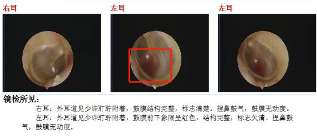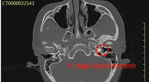检查发现,曹女士左侧耳膜虽完整,但透过耳膜可以看到中耳腔内长有红色肿瘤,紧紧贴着耳膜,在耳内镜下还可以看到耳膜有着与耳鸣和心跳节律一致的搏动。随后的CT、MRI检查,再次验证了张主任的猜想:鼓室球体瘤。