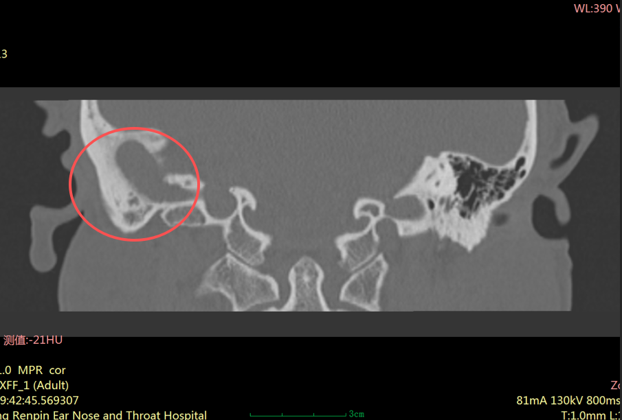 “患者右耳中耳腔已形成胆脂瘤,它像一颗不断侵蚀听骨的‘定时炸弹’,若再拖延,可能引发面瘫、颅内感染等严重并发症。”耳科主任张朝梅指着CT影像解释道。