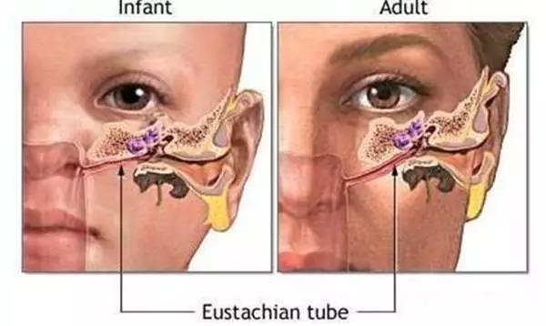 腺样体在出生时即存在,2-6岁增生旺盛,青春期后逐渐萎缩。腺样体的生理性肥大为正常生理现象。但当腺样体炎症反复发作,或邻近部位(腺样体的位置特殊,后上为颅底,外为咽鼓管咽口,可经咽鼓管至中耳(图3),前下为后鼻孔,可通鼻腔、鼻窦,下方可通口腔、喉腔)的炎症(比如慢性鼻-鼻窦炎,扁桃体炎、咽炎)反复刺激时,可导致腺样体发生病理性增生(图3)。